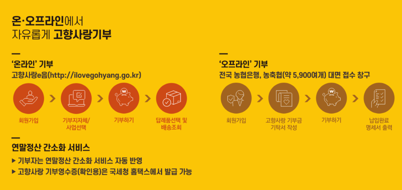 - 단, 농협에서 기부금을 납부한 경우에도 답례품 신청은 별도로 온라인에서 진행해야 합니다.