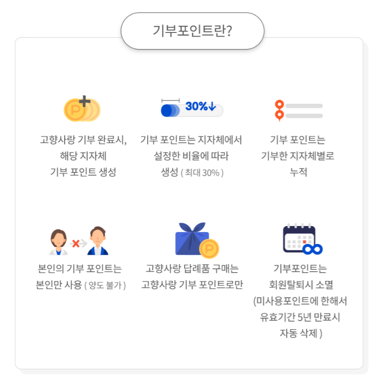 - 포인트 활용: 고향사랑e음에서 기부 금액의 30%에 해당하는 포인트가 적립되며, 답례품몰에서 이를 사용해 물품을 주문할 수 있습니다.