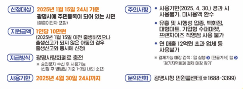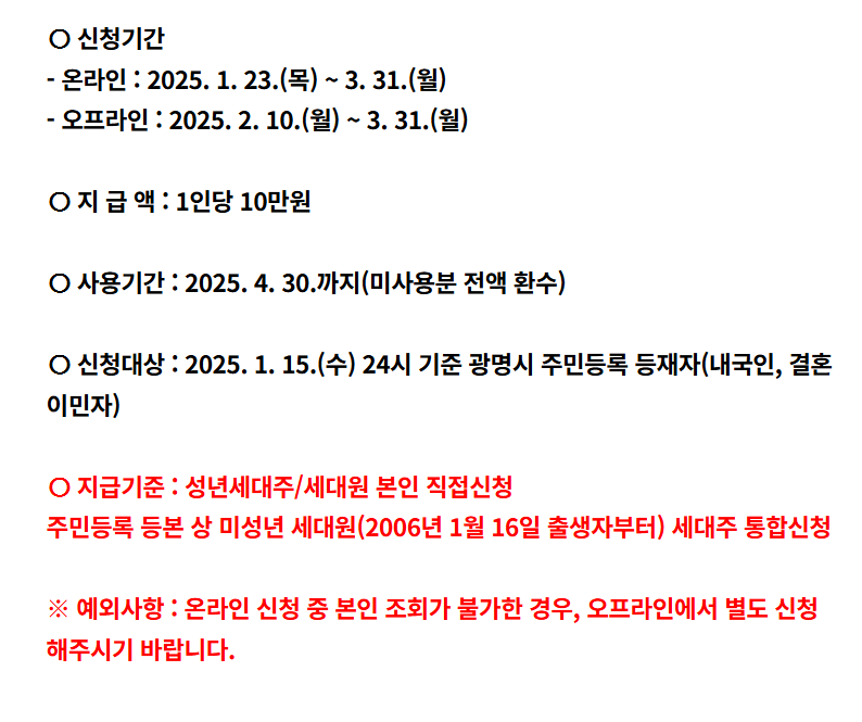 - 지원 대상: 2025년 1월 15일 기준 광명시에 주민등록이 되어 있는 내국인 및 결혼이민자