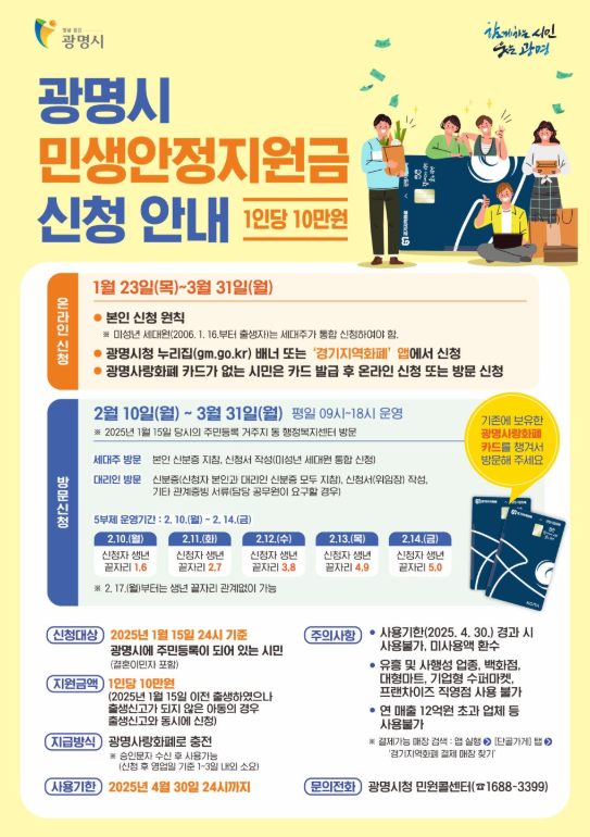 광명시는 지역 경제 활성화와 시민들의 생활 안정을 목표로 2025년 민생회복 지원금을 제공합니다.