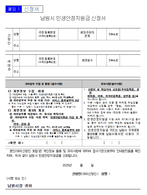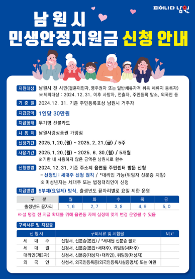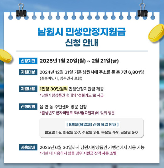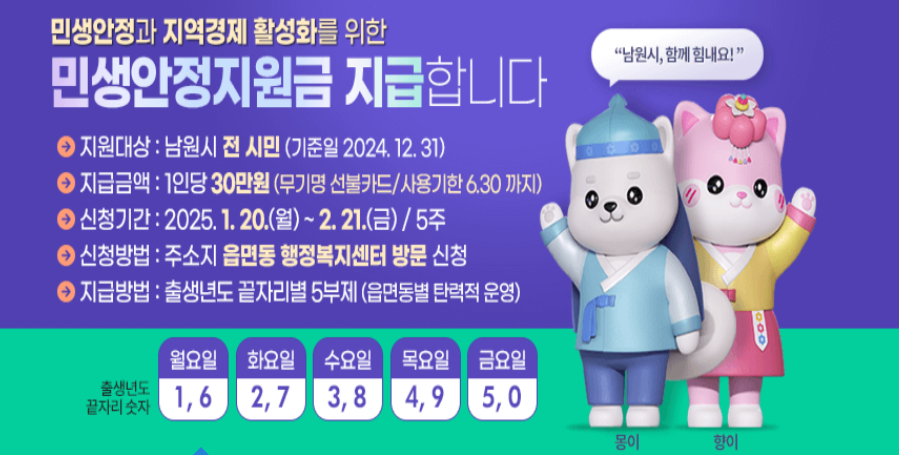 남원시는 시민들의 생활 안정과 지역 경제 활성화를 목표로 2025년 민생안정 지원금을 지급합니다.