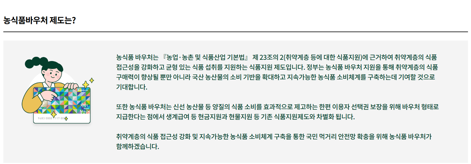 해당 제도는 단순한 지원금을 제공하는 것이 아니라 실질적으로 신선한 농축산물을 구매할 수 있도록 지원하여, 저소득층의 영양 불균형 해소와 건강 증진을 목표로 합니다.