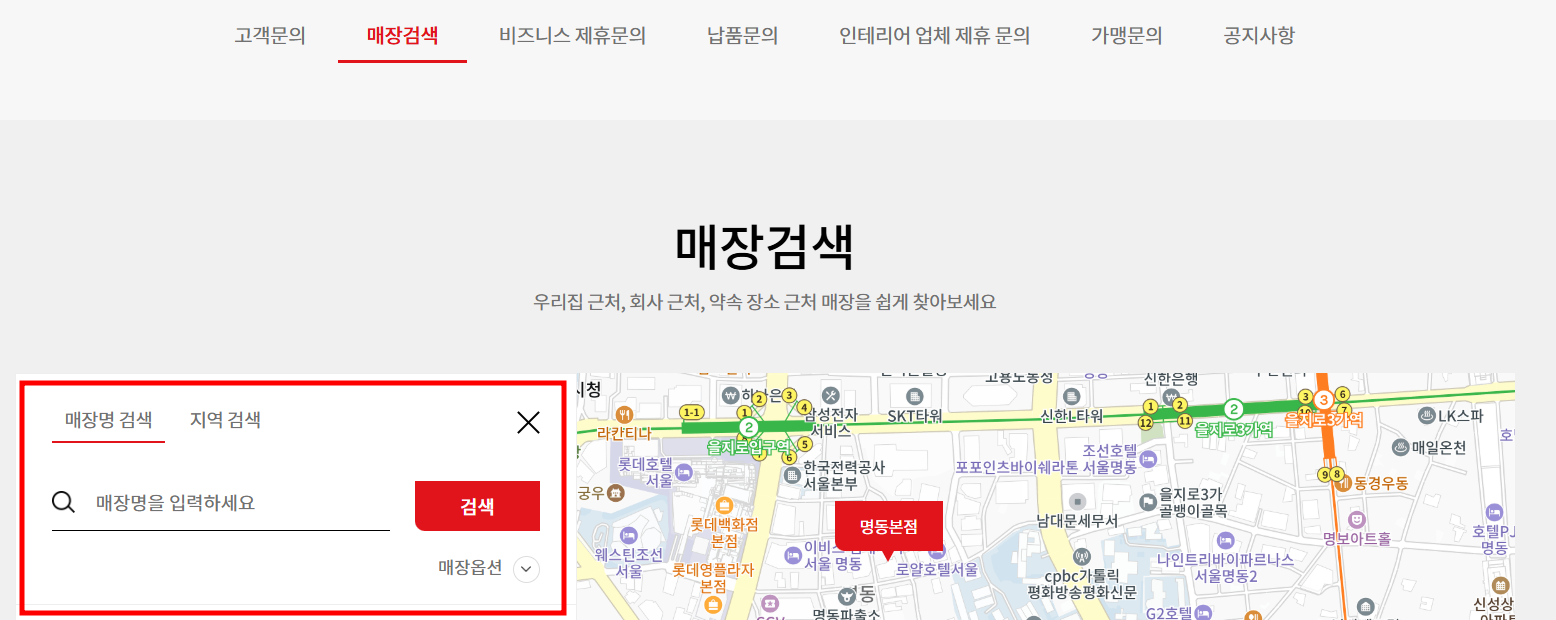 - 고객지원 메뉴로 이동한 뒤, 매장 검색을 선택합니다.