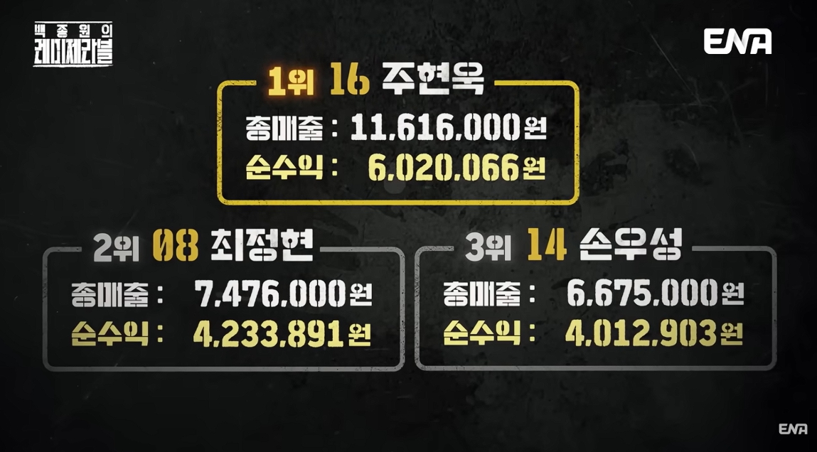 그는 총매출 11,616,000원과 순수익 6,030,066원을 기록하며 최강 도전자로 자리매김했다.