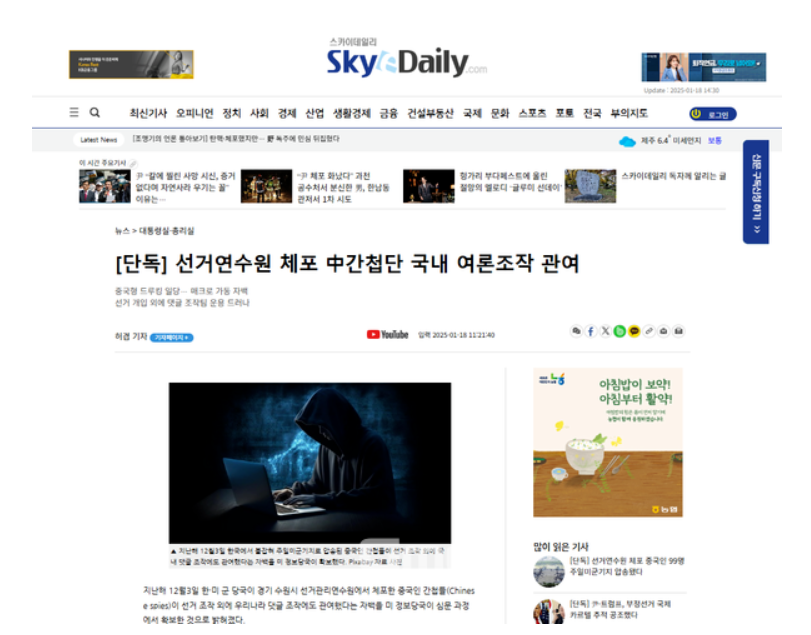 스카이데일리는 2025년 1월 16일 "지난해 12월 3일 한·미 군 당국이 수원 선거관리연수원에서 중국인 간첩 99명을 체포한 후 주일 미군기지로 압송했다"는 단독 기사를 보도했습니다.