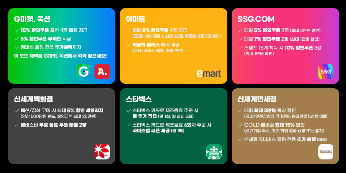 이마트, 신세계백화점, SSG.COM, 스타벅스, G마켓/옥션, 신세계면세점 등에서 폭넓은 할인 및 적립 혜택을 제공하는 것이 특징입니다.
