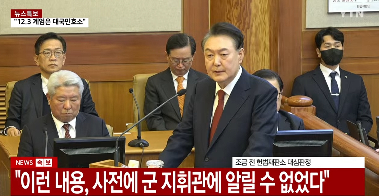 윤 대통령은 최후 변론에서 지난해 12월 3일 선포된 비상계엄이 국가 안정을 위한 불가피한 조치였다고 주장했다.