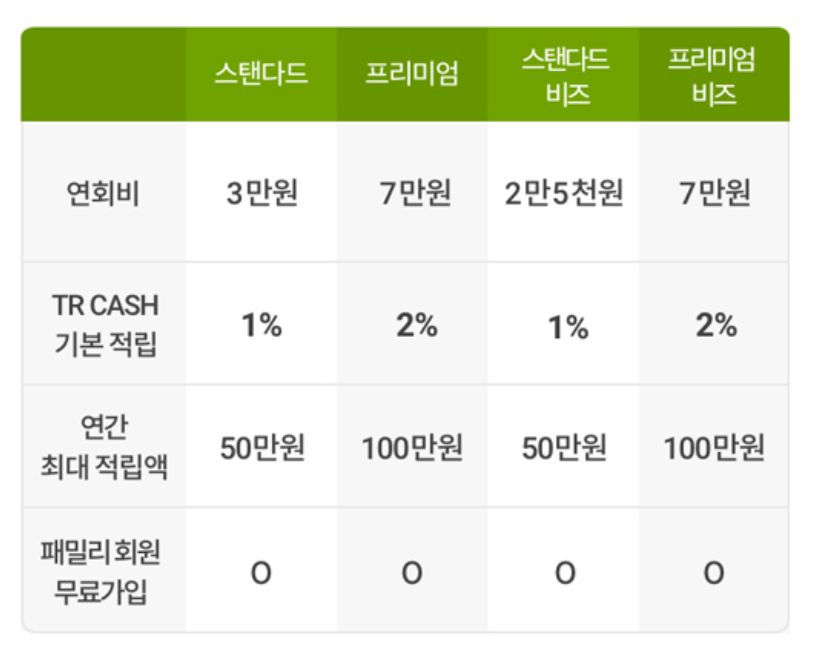 | 회원제 유형 | 연회비 | TR CASH 적립률 | 연간 최대 적립액 | 패밀리 회원 무료 등록 |