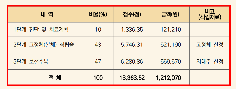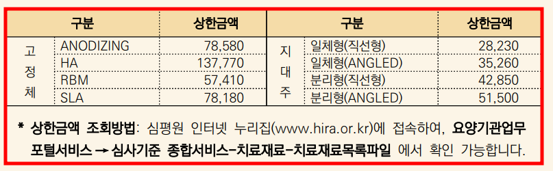 - 급여 제한 재료: 분리형 식립재료와 비귀금속 도재관(PFM crown)만 급여 혜택을 받을 수 있습니다.
