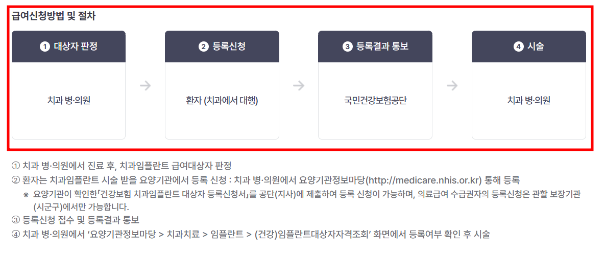 - 대상자 판정: 치과에서 건강보험 임플란트 급여 대상 여부를 확인합니다.
