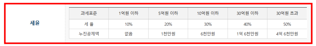 상속세율 역시 개정되면서 최고세율이 기존 50%에서 40%로 조정되었습니다.