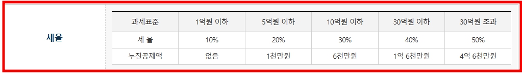 | 10억 원 초과 ~ 30억 원 이하 | 40% | 1억 6,000만 원 |