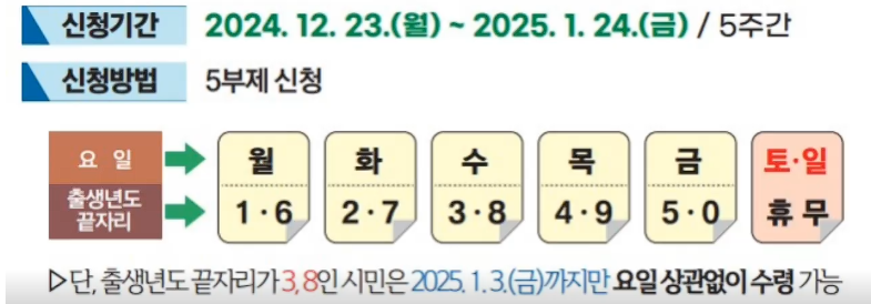 신청은 2024년 12월 23일(월)부터 시작되어 2025년 1월 24일(금)까지 진행됩니다. 신청 편의를 위해 출생연도 끝자리에 따라 5부제로 운영되며, 공휴일에는 요일에 상관없이 신청 가능합니다.