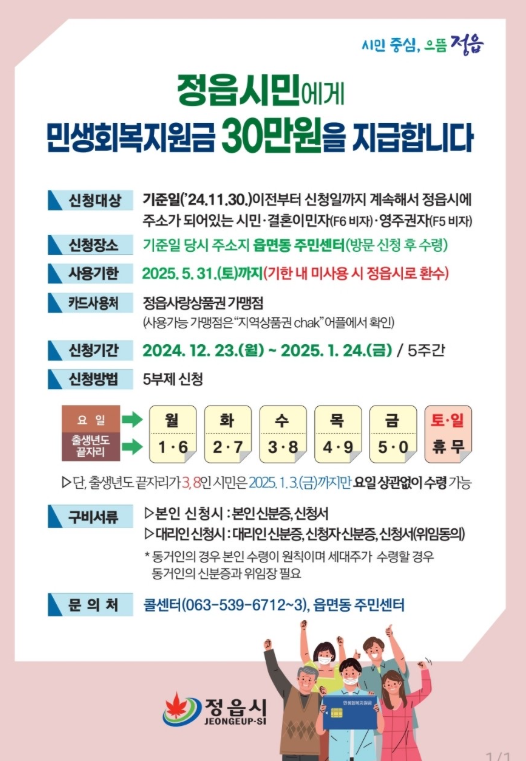 정읍시는 2025년, 지역 주민들을 위한 민생회복 지원금을 통해 경제적 어려움 극복과 지역 경제 활성화를 동시에 이루고자 합니다.