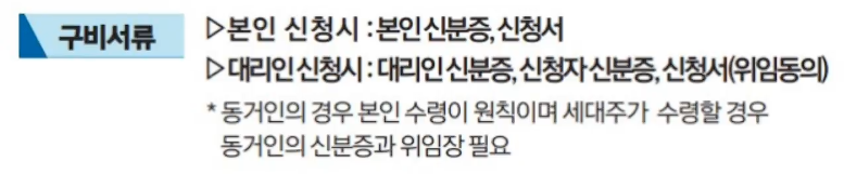 - 대리 신청: 대리인 신분증, 위임자 신분증, 위임장 및 관계 증빙 서류
