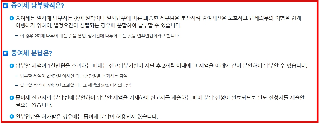 증여세는 기본적으로 일시 납부해야 하지만, 일정 금액 이상일 경우 분할 납부가 가능합니다.