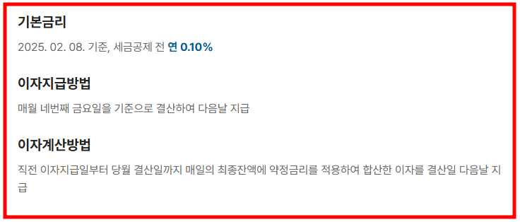 - 금리: 연 0.10%의 기본 금리 제공 (2025년 2월 기준)