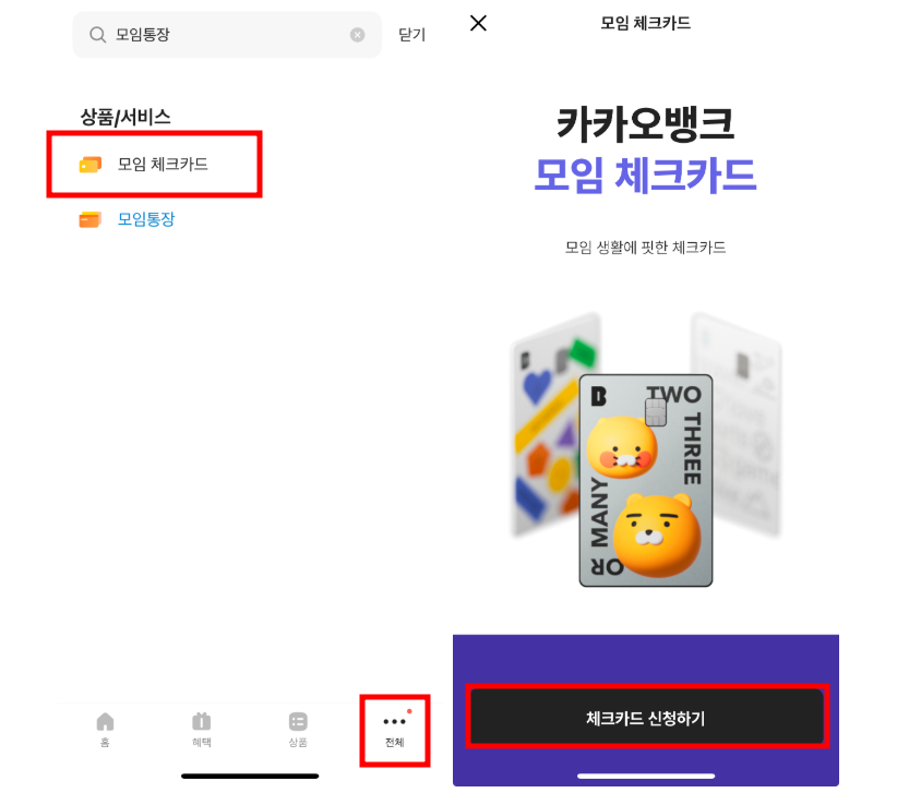 - '전체' → '모임 체크카드' 검색 후 선택