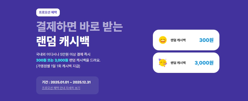 - 캐시백 조건: 5만 원 이상 결제 시 300원 또는 3,000원의 랜덤 캐시백 제공