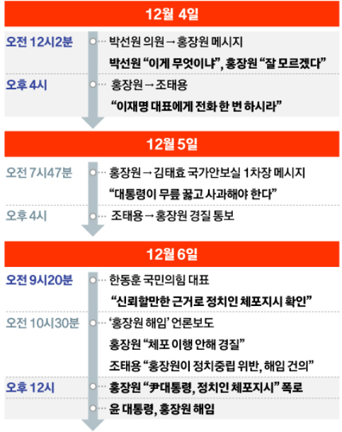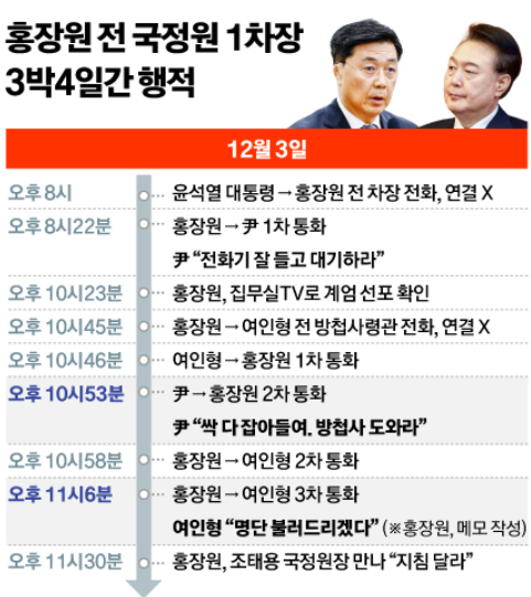 - 하지만 조태용 국정원장은 20시경 대통령과 통화하며 "관저에 있으며, 미국 출장 예정"이라고 보고.